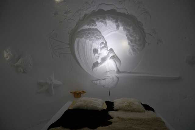 Полностью ледяное помещение гостиницы Iglu-Dorf Zugspitze Zugspitzplatt в Германии отличается необходимостью постоянно быть в теплой одежде и очень необычными снежными фресками