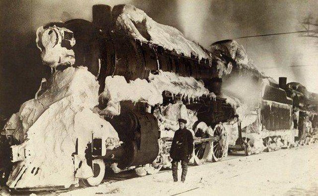 Обледеневший поезд на вокзале, после завершения маршрута. Канада, 1918 год.