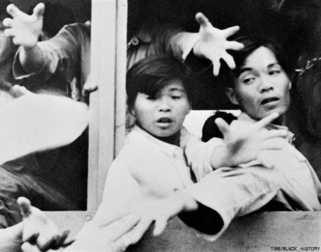 Некоторые из 60,000 китайских беженцев, нелегально прибывших в Гонконг из Китая. Они протягивают руки из грузовика, прося еды, во время выдворения обратно в Китай. 28 мая 1962 года.