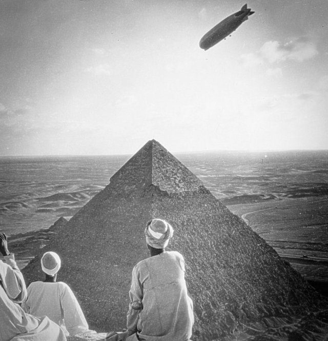 Египтяне смотрят, как дирижабль «Граф Цеппелин» падает на пирамиды Гизы. 1931 год.