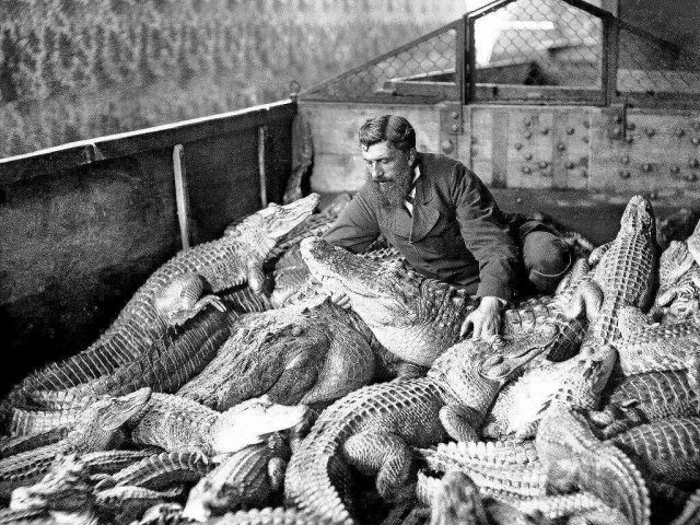 Мужчина среди аллигаторов и кайманов в террариуме. Флоренция, Италия, 1900 год.