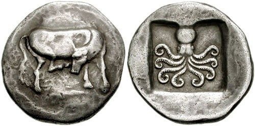 2500-летняя греческая серебряная монета Дидрахма из Эретрии с коровой и осьминогом.