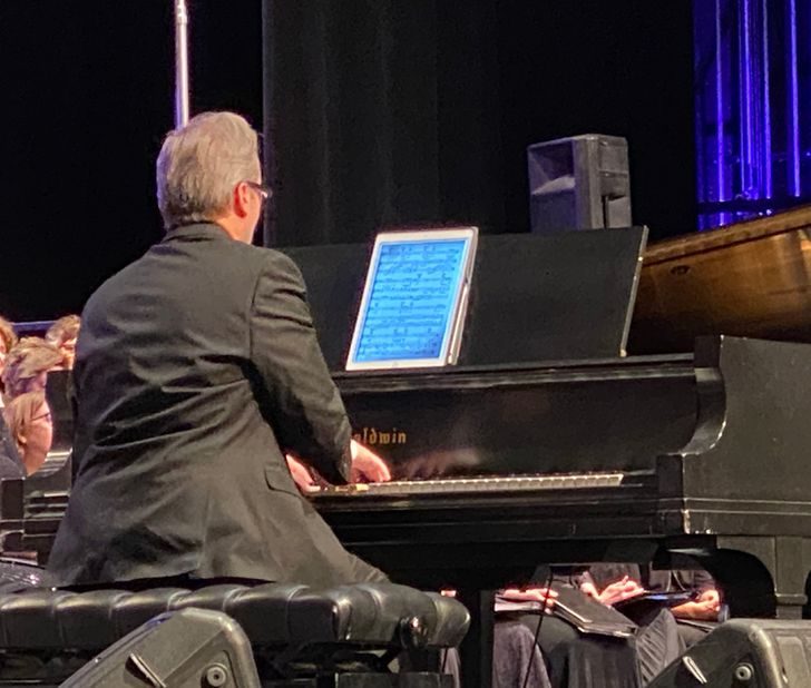 Перед пианистом стоят не бумажные ноты, а электронный планшет – так удобнее и проще