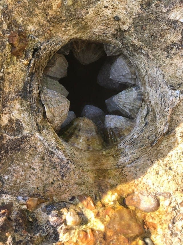 Эти штуки — морские блюдечки. Скорее всего дыру оставил бур, и там поселились улитки.