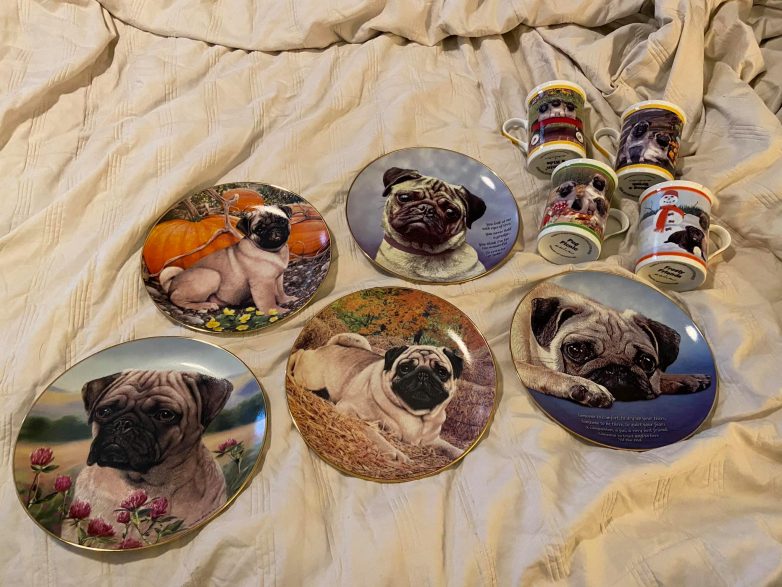 «Я мопсоман. Мне повезло и я нашла тарелки и кружки с изображением мопсов на барахолке, не смогла удержаться и купила их все!»