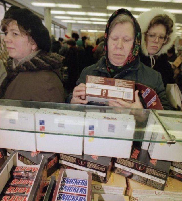 Советские люди покупают заграничные сладости, Москва, 1991 год.
