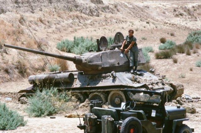 Турецкий солдат позирует на фоне захваченного Т–34/85 вооруженных сил Кипра, Кипр, июль 1974 года.