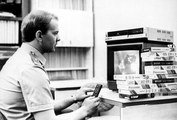 Сотрудник ростовской таможни отсматривает ввозимые видеокассеты, 1991 год, Россия