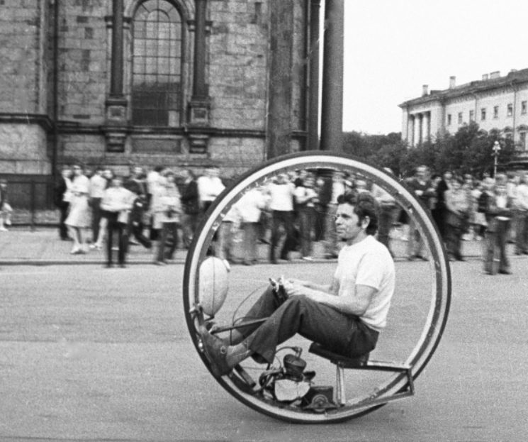 Инженер Эдуард Мельников и его колесо–самокат, Исаакиевская площадь, Санкт-Петербург, 1981 год