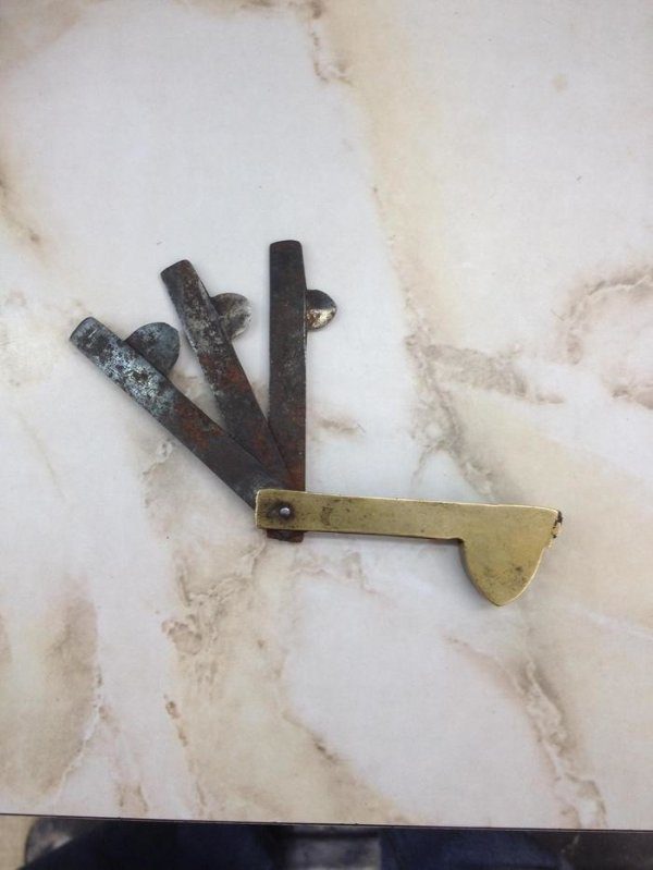 Ответ: Это старинное устройство, которое использовалось для проверки пороха. Насыпаем порох в устройство, совершаем выстрел, и пластинка сдвигается на определенную величину, по которой можно судить о качестве пороха и о том, сколько понадобится этой смеси, чтобы совершить полноценный выстрел.