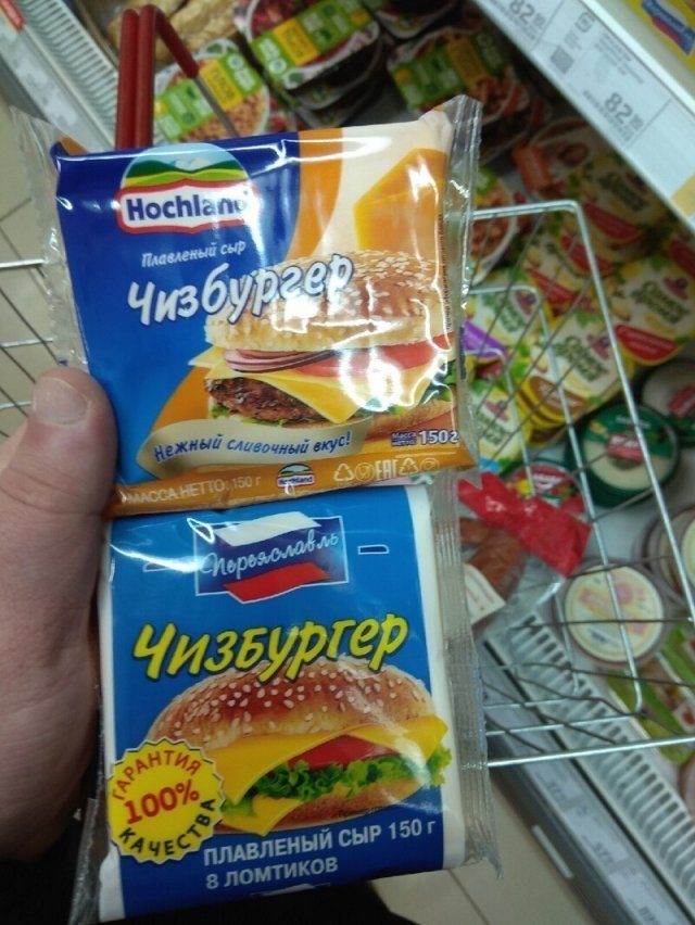 От иностранных продуктов в России стараются постепенно отказываться, заменяя их отечественными аналогами. Но есть и хитрые маркетологи, которые просто воруют дизайн у известных брендов. Выглядит все это довольно забавно. Сталкивались ли с чем-нибудь из этого на полках магазинов?