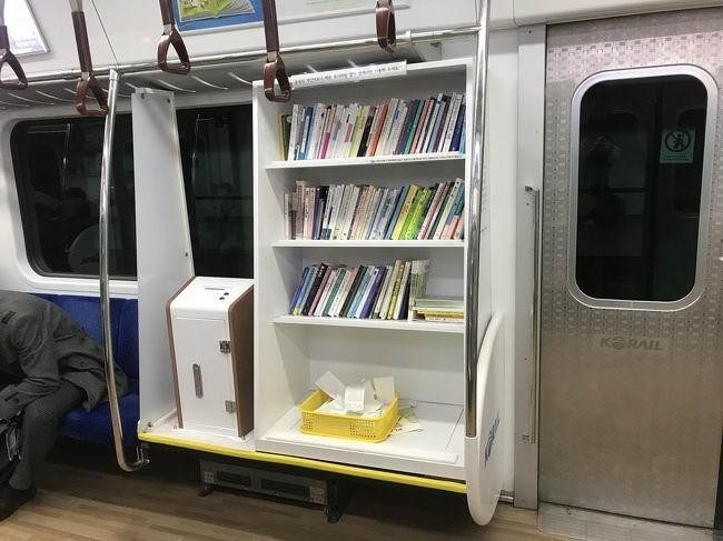 Книжный шкаф в общественном транспорте, чтобы люди не скучали в долгой дороге