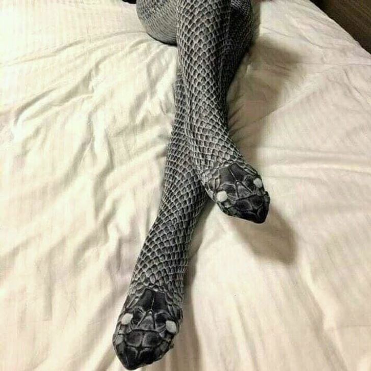 Дизайнер колготок не подвел, так и хочется схватиться за лопату при виде этих «рептилий»