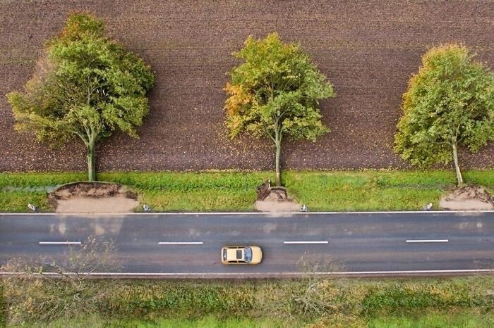 Может показаться на первый взгляд, что это фото — фотошоп, или кто-то соединил два кадра, получив двухцветный лес. Однако это лишь последствия наводнения, никаких редакторов. Вода повредила лес, сделав его двухцветным
