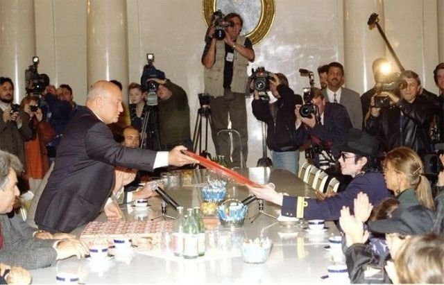 Юрий Лужков принимает Майкла Джексона в Белом зале Московской мэрии. 16 сентября 1996 года.
