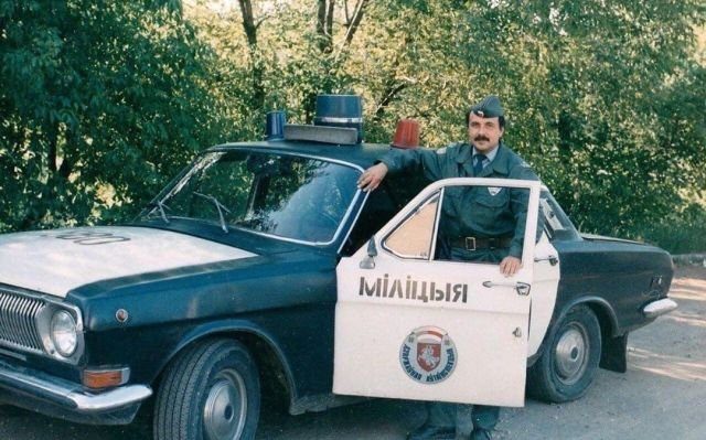 Белорусский милиционер рядом со своей патрульной Волгой, начало 90-х.