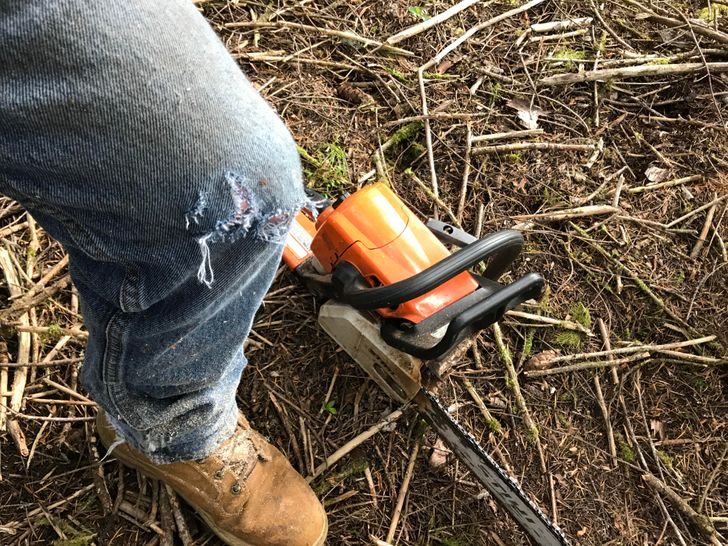 Бензопила только порвала джинсы. Он на седьмом небе от счастья.