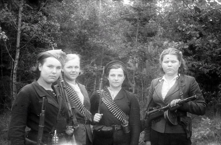 Девушки — бойцы белорусского партизанского отряда с личным оружием, 1944 год