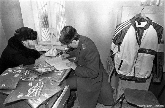 Пойманный фарцовщик с товаром в отделении милиции, 1980–е годы, СССР.