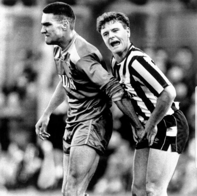 Винни Джонс сжимает гениталии Пола Гаскойна во время футбольного матча между АФК Уимблдон и Ньюкасл Юнайтед. Лондон, 1987 год.