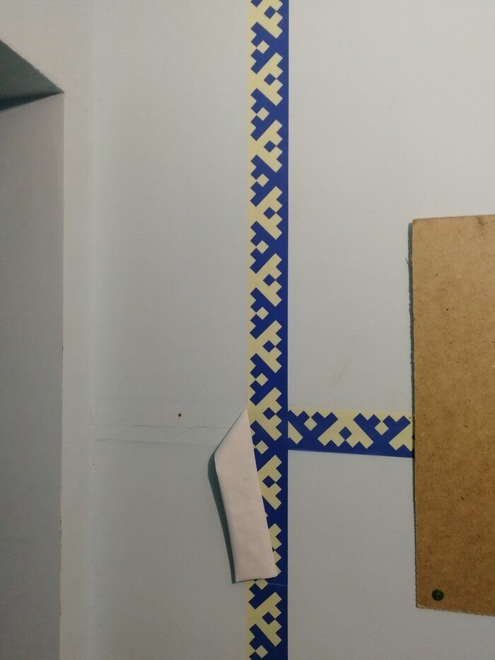 Оформление стен в одном из подъездов. Изначально кажется, что это очень интересные орнамент. А на деле – обычная клейкая лента, прикрывающая трещину на стене.
