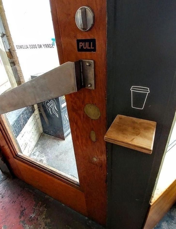 В этой кофейне есть полочка для стаканчика, чтобы вы могли нормально открыть дверь, если у вас заняты руки