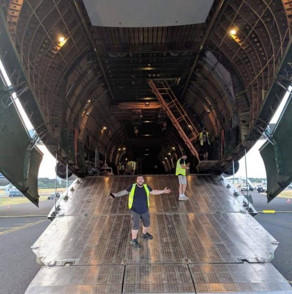 Парень на фоне погрузочно-разгрузочной площадки грузового самолета АН