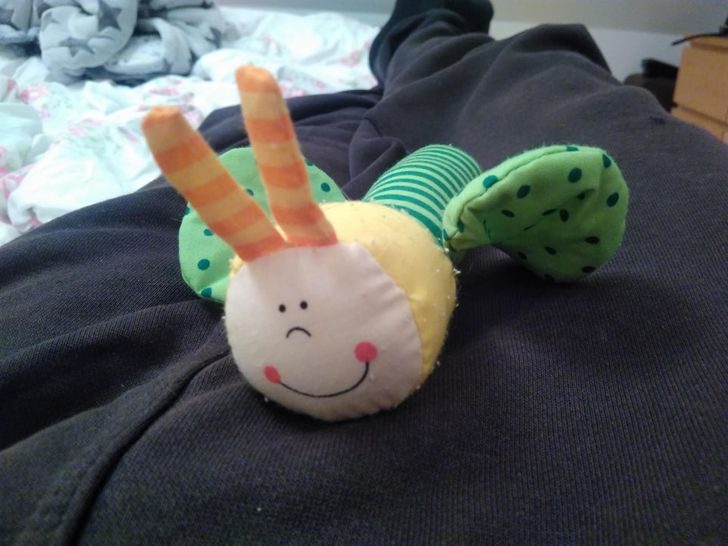 Грустно-радостная игрушка однозначно выражает радость, потому как на интересном месте лежит))))