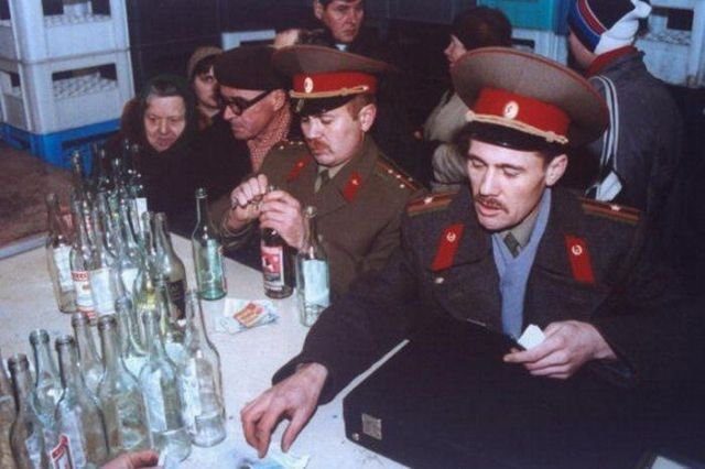 Военные приобретают водку в обмен на пустые бутылки, 1991 год.