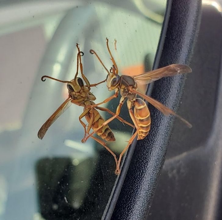 Отражение осы в зеркале более дружелюбно, чем она сама. Смотрите, лапкой машет!