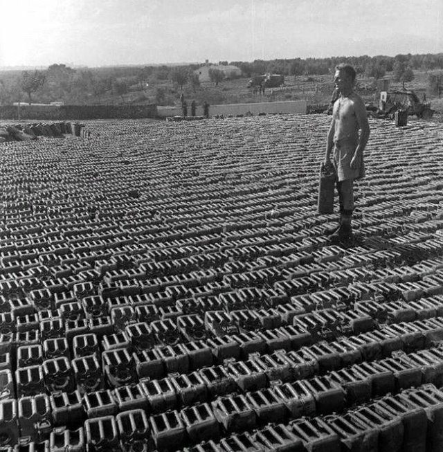 Новозеландский солдат на канистрах с бензином. Италия, 1943 год.