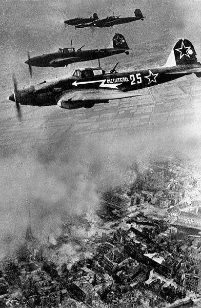 Эскадрилья штурмовиков идет на штурм аэродрома Темпельгоф, 1945 год.