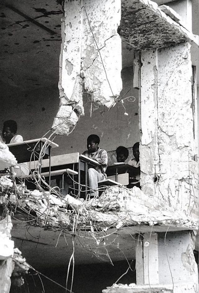 Дети на уроке в разрушенной школе, Ангола, 1997 г.
