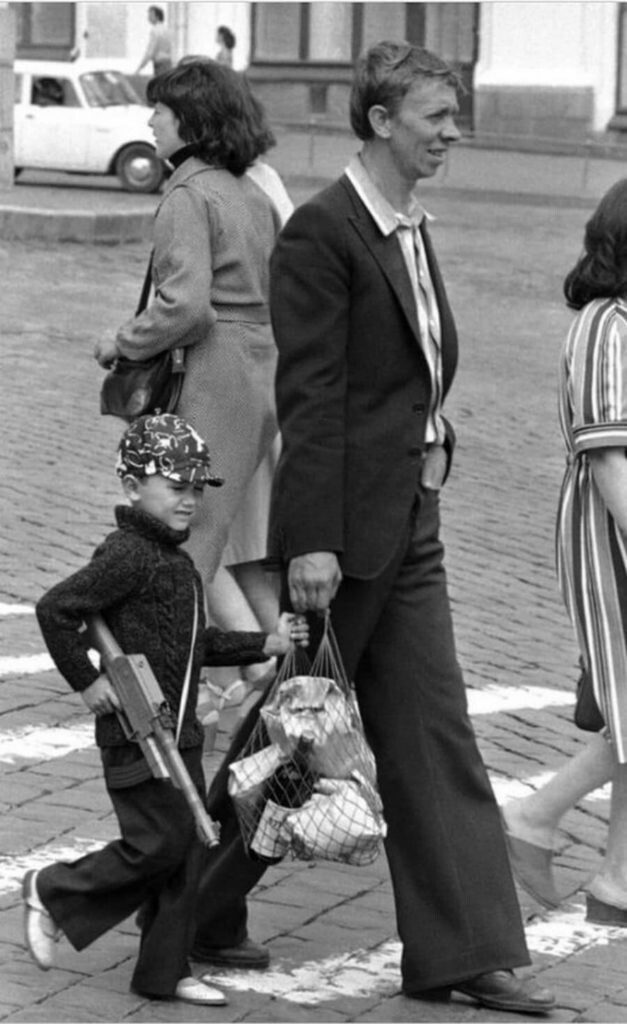 Советский мальчик с игрушечным пулеметом идет по Красной площади с отцом, держась за авоську с товарами.