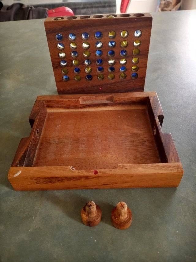 Старая игра под названием «Четыре в ряд» — цель состоит в том, чтобы собрать горизонтальную, вертикальную или диагональную линию из шариков одного цвета.