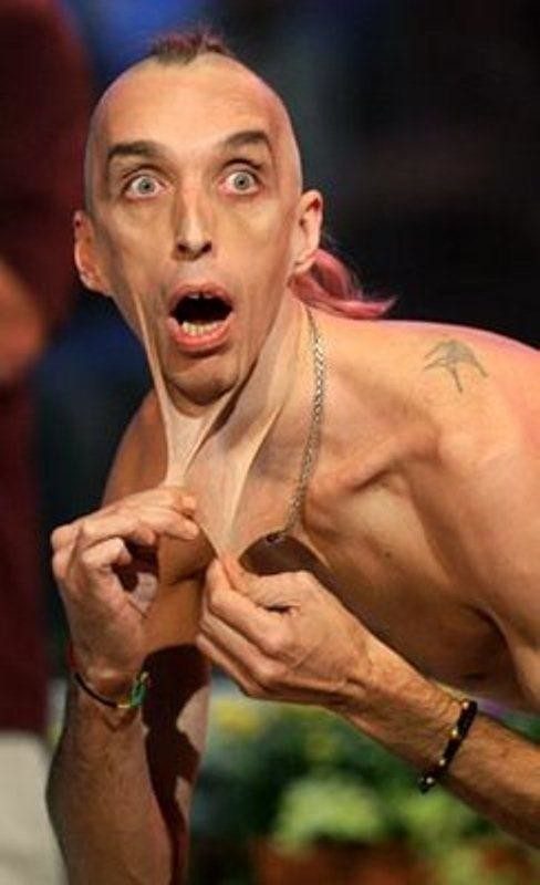 Синдром Элерса – Данлоса – наследственное нарушение развития коллагеновых структур, характеризующееся суставной гипермобильностью, гиперупругостью кожи и выраженной хрупкостью тканей.Гари Тернер, человек-резина, с тем же синдромом, выступает на публику, демонстрируя возможности своей «резиновой кожи»