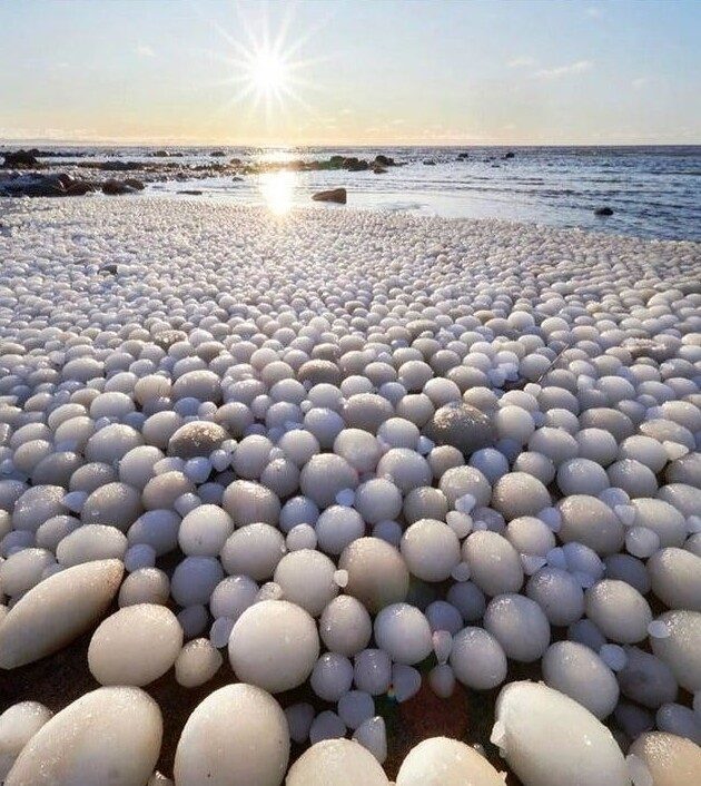 Ледяные яйца — это редкое явление, возникающее, когда лед перекатывается ветром и водой (Северная Финляндия)