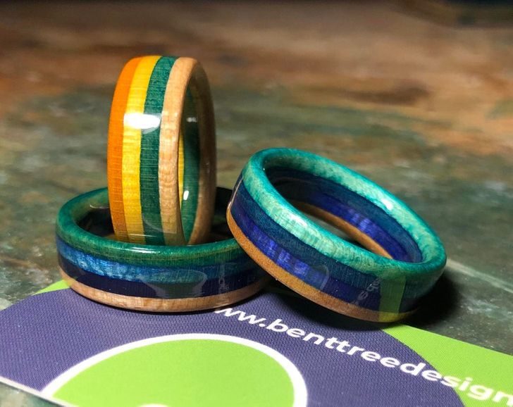 Эти кольца сделаны из старой доски для скейтборда. Персональный заказ.