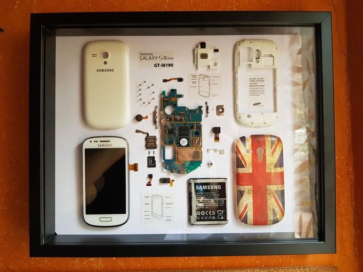 Когда старый телефон помер, его в разобранном виде выставили в рамочке. На память.