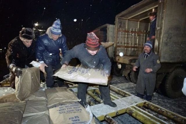 Добровольцы помогают разгружать гуманитарную помощь из Израиля, Россия, 1990 год