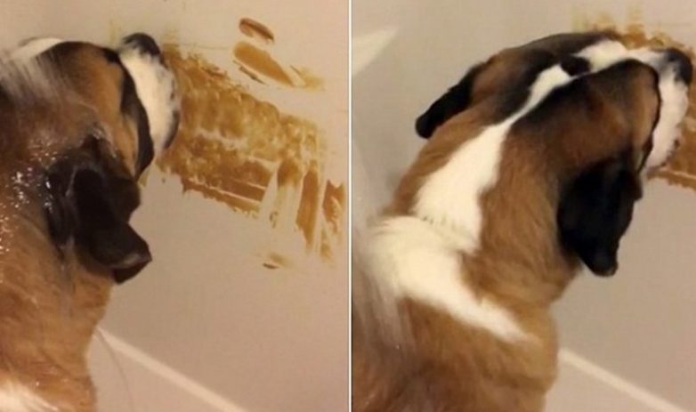 На стену в ванной комнате намазали лакомство для собаки. Теперь питомца можно тщательно выкупать
