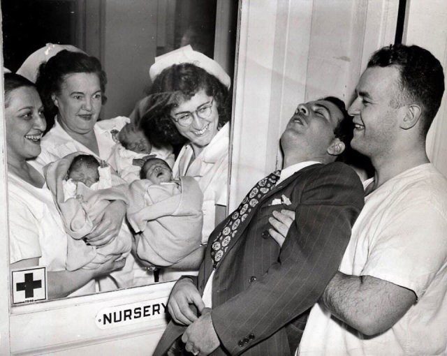 Сотрудники роддома показывают счастливому отцу его новорожденных тройняшек. Нью-Йорк, 1946 год