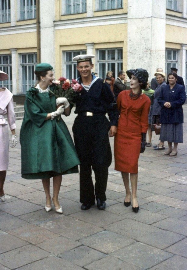 Модели Dior с моряком на улице в Москве, 1959 год.