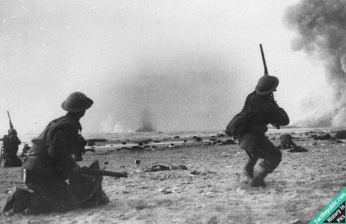 Британский солдат пытается сбить немецкий бомбардировщик при налете на Дюнкерк, май 1940