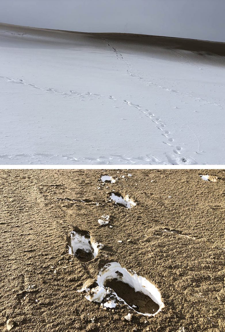 Сначала в пустыне выпал снег, потом ветер намел сверху песка, и получился «тортик»