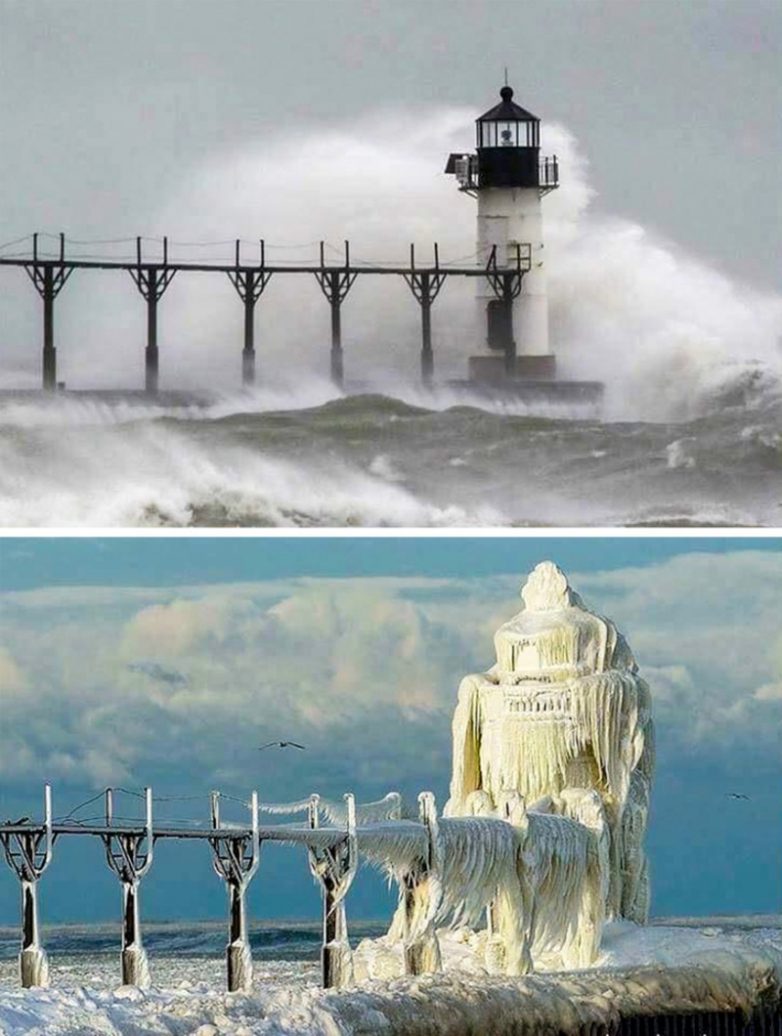 Маяк сфотографировали до снежной бури. И он же — уже после стихии