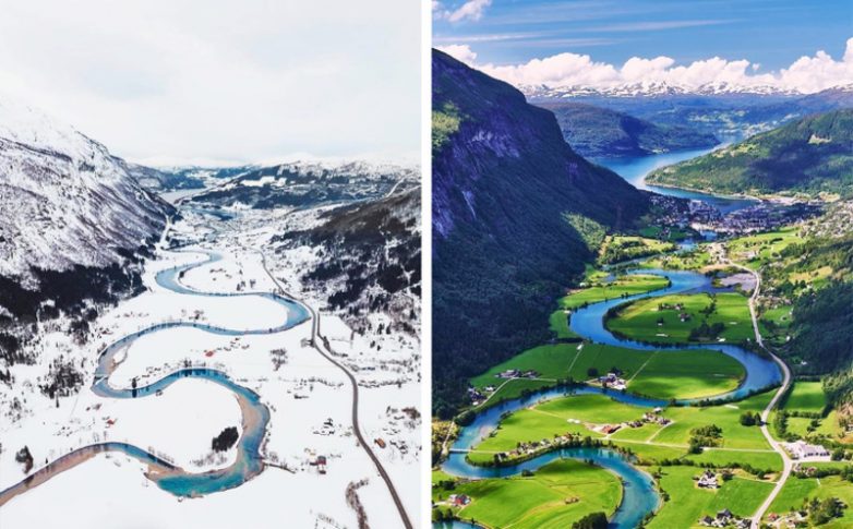 Стрюн — муниципалитет в Норвегии. На одном снимке — в зимнее время года, а на втором — в разгар лета