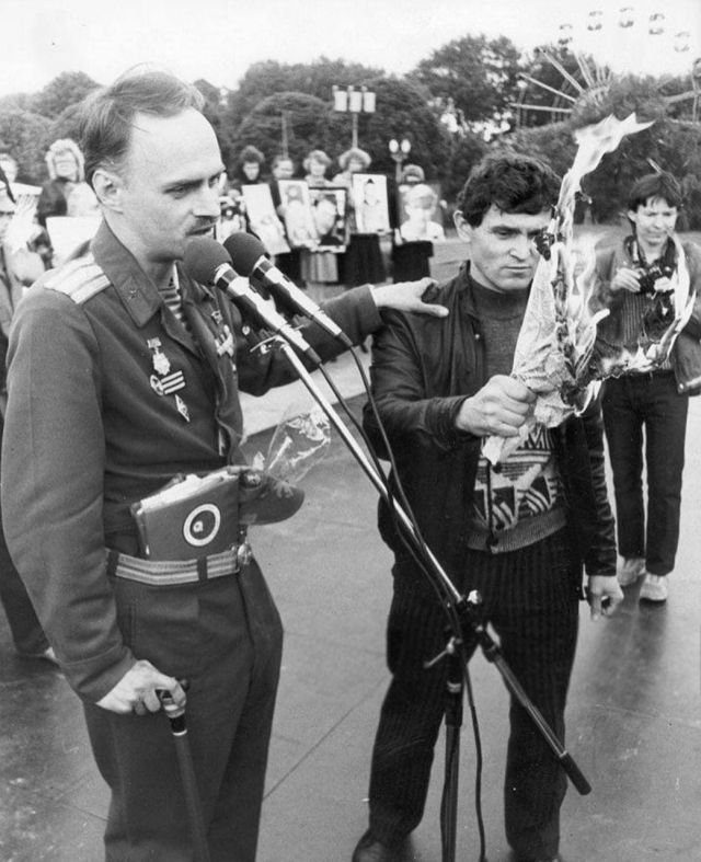 Советские ветераны Афгана сжигают газету Красная звезда в знак протеста против умалчивания количества погибших в Афганистане. СССР, июнь 1990 года.