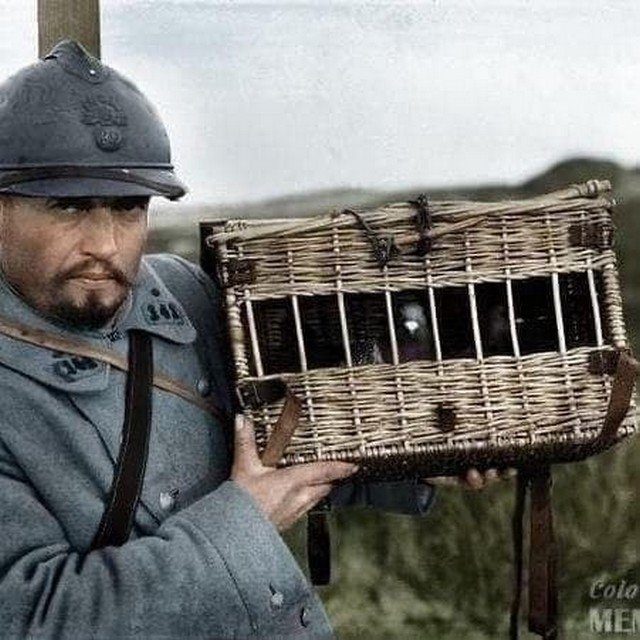 Французский солдат с почтовыми голубями, 1917 год. Первая мировая война.