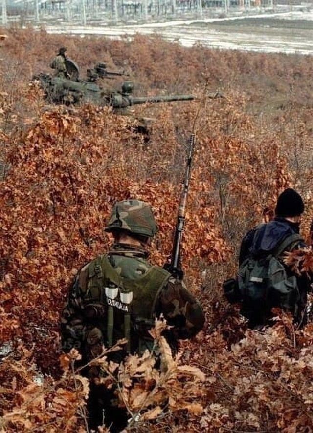 Югославская полиция при поддержке среднего танка Т-55А проводит патрулирование местности в поиске позиций Армии освобождения Косово в общине Глоговац. 21 марта 1999-го года.